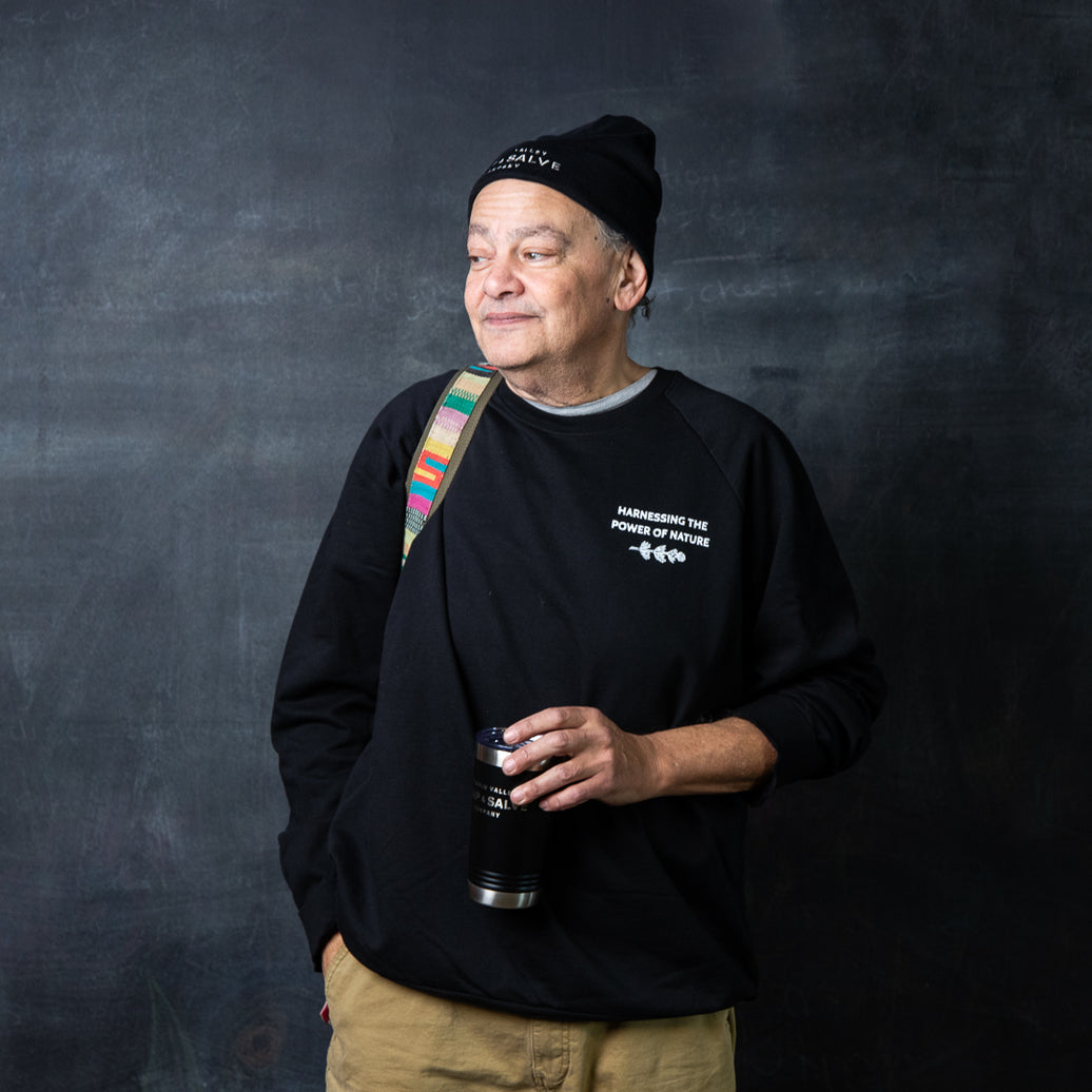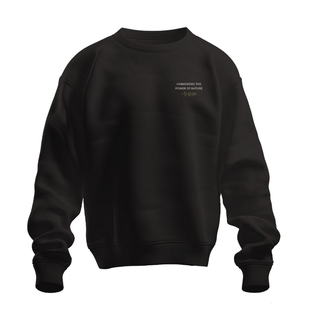 - Black w/Green: A black sweatshirt with our logo and wildflower pattern on the back in hunter green color. The words "Harnessing the Power of Nature" located on the front are white with a green herb sprig below.