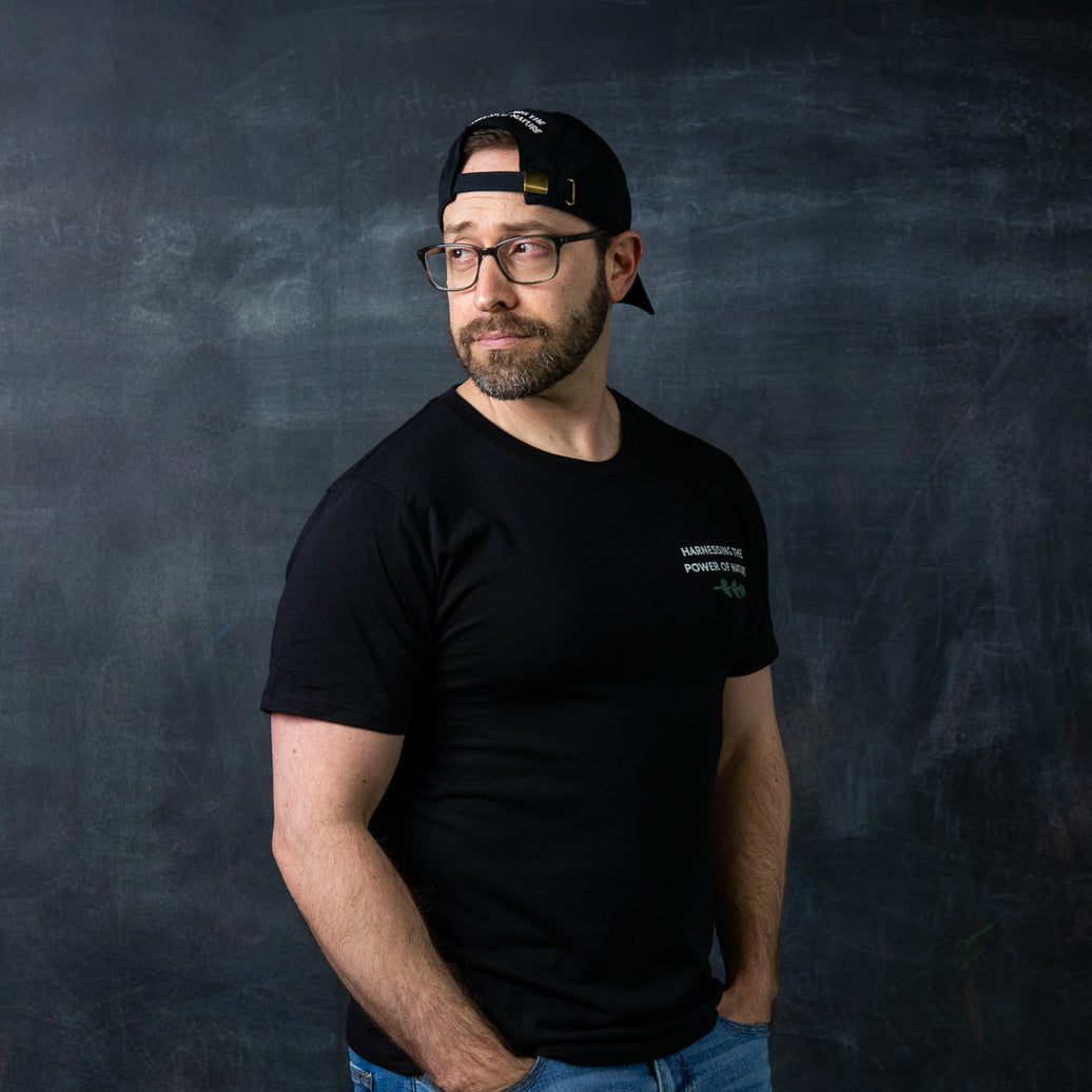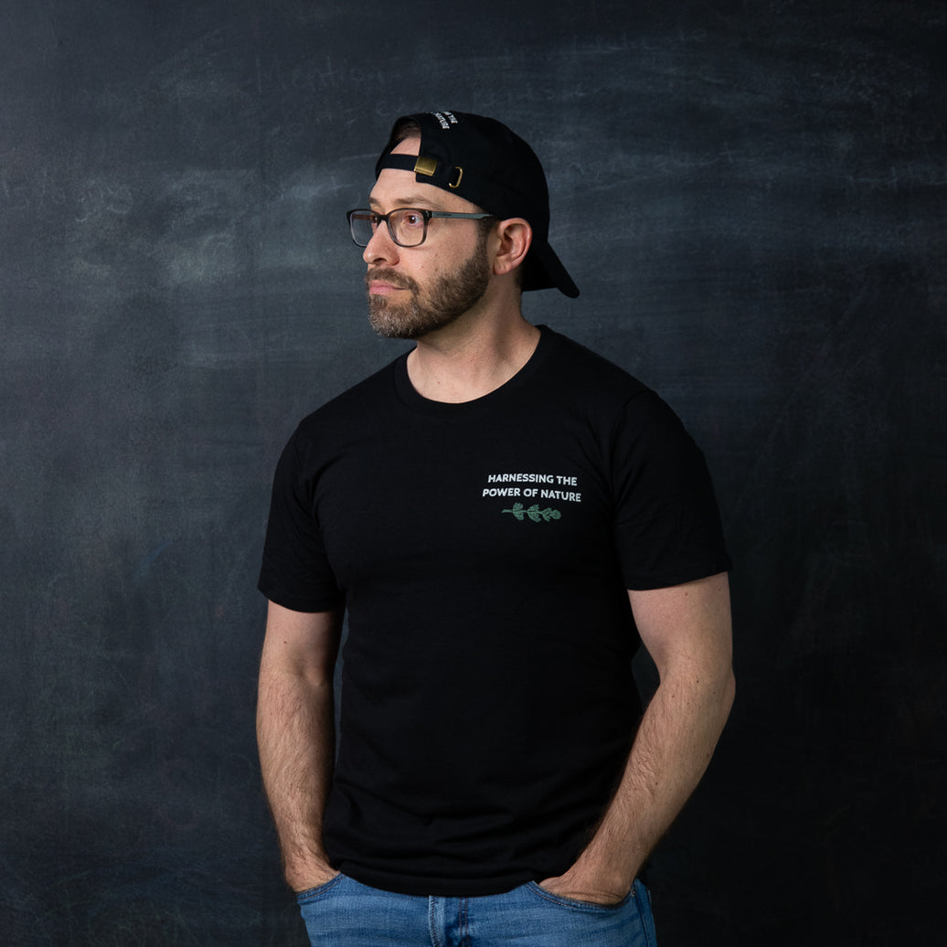 - Black w/Green: A black sweatshirt with our logo and wildflower pattern on the back in hunter green color. The words "Harnessing the Power of Nature" located on the front are white with a green herb sprig below.
