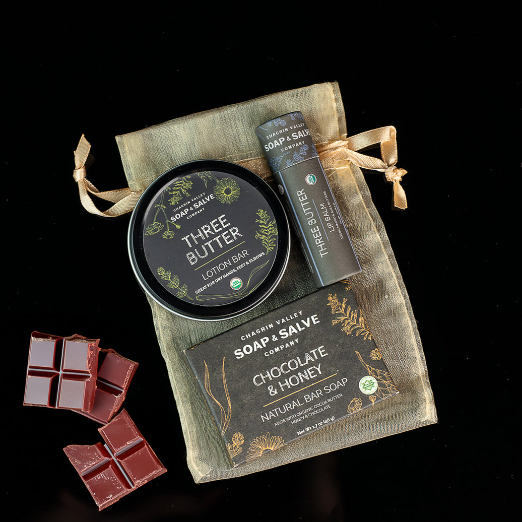 Brighten someone's day with a thoughtful gift that includes a travel-size bar of natural soap, an organic lip balm, and an organic lotion bar tucked in a colorful organza bag. See descriptions below.