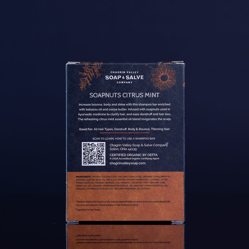 Increase bounce, body and shine with this organic shampoo bar made with Soapnuts called "aritha" in Ayurvedic medicine. Soapnuts, an excellent hair tonic, has long been known for its benefits for healthy hair and scalp. They add body, bounce, and shine to dull hair, help treat scalp infections and dandruff, and have been used in Ayurvedic medicine to prevent hair loss. The natural saponins not only cleanse hair without over-drying, but also add luster, increase body and volume, and make hair feel thick, silky, smooth, and more manageable. Natural antifungal and antibacterial properties in soapnuts may help with dandruff.